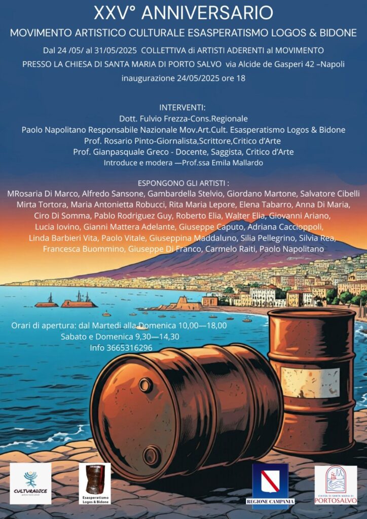 Quest’anno, il movimento artistico-culturale Esasperatismo – Logos & Bidone celebra un traguardo significativo: 25 anni di provocazione intellettuale e sfida alle convenzioni estetiche. Fondato nel 2000 da Adolfo Giuliani, il movimento è stato raccontato e accompagnato nel tempo anche dalla penna della professoressa Emilia Mallardo, moglie del fondatore.